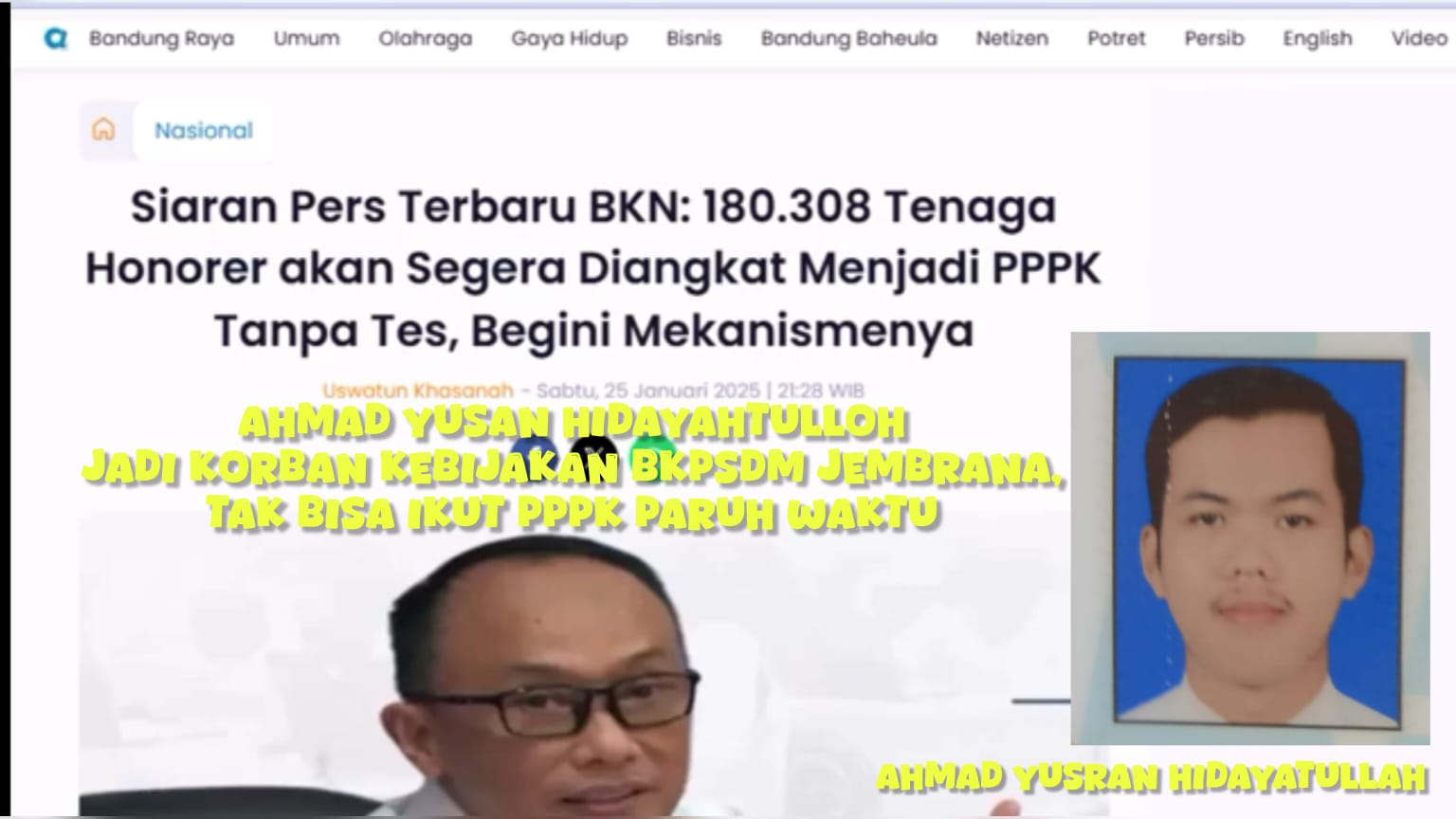Jembrana, Bali – Ahmad Yusan Hidayahtulloh seorang pegawai kontrak di Pemkab Jembrana, menjadi korban kebijakan kepegawaian yang dinilai tidak transparan. Akibat mengikuti tes CPNS, ia kini dirumahkan dan tidak bisa mengikuti seleksi PPPK paruh waktu, meski sebelumnya mendapat informasi berbeda dari Badan Kepegawaian Daerah (BKD) Jembrana, Kamis (30/1/2025).