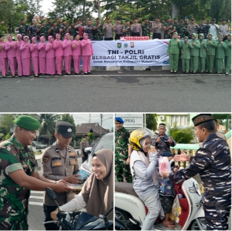Mukomuko – Personel TNI-POLRI dari Kodim 0428/MM dan Polres Mukomuko kompak dan bersinergi disaat kegiatan berbagi takjil gratis kepada masyarakat Mukomuko dimomentum Bulan Suci Ramadhan 1446 H/2025, kegiatan yang digelar di Bundaran Kota Mukomuko, turut dihadiri pengurus Persit dan Bhayangkari Cabang Mukomuko serta personel Kodim 0428/MM dan Personel Polres Mukomuko, Kamis Sore (27/Maret/25).