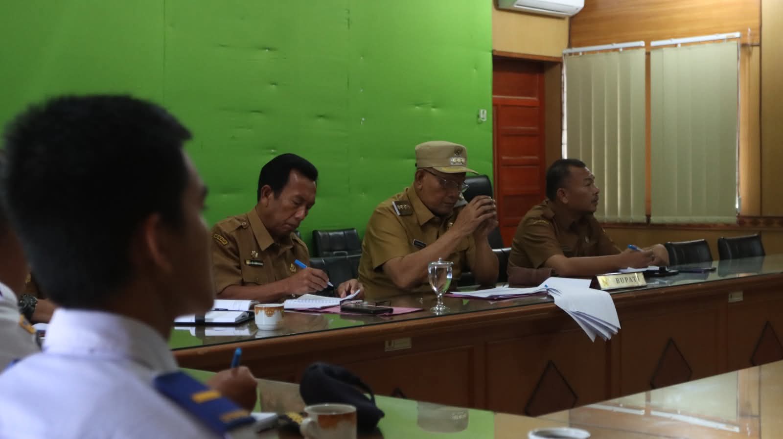 Bupati Dairi, Vickner Sinaga, didampingi Asisten Perekonomian, Suasta Ginting, Kadis Perindagkop, Iwan Taruna Berutu, Kepala Bappeda, Romedi Bangun, serta perwakilan OPD lain turut mengikuti rapat tersebut melalui zoom meeting, di ruang rapat bupati.