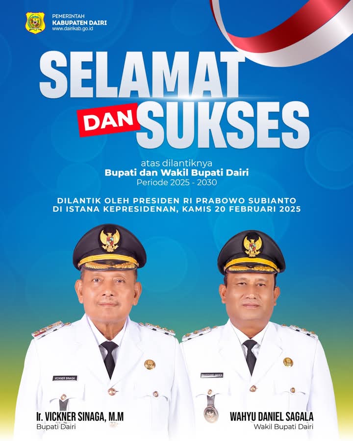Informasi yang diterima, pelantikan kepala daerah akan digelar pada hari ini, Kamis , 20 Februari 2025. Bupati dan Wakil Bupati Kabupaten Dairi terpilih, Vickner Sinaga, dan Wahyu Daniel Sagala akan turut serta dalam peristiwa penting ini.