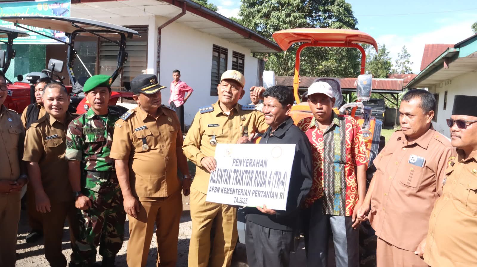 Dairi, Sumut – Bupati Dairi, Vickner Sinaga, bersama Wakil Bupati, Wahyu Daniel Sagala didampingi Sekda, Charles Bantjin menyerahkan alat dan mesin pertanian berupa 13 traktor roda empat kepada kelompok tani di Kabupaten Dairi, Senin (7/7/2025), di pelataran kantor Dinas Pertanian Dairi.