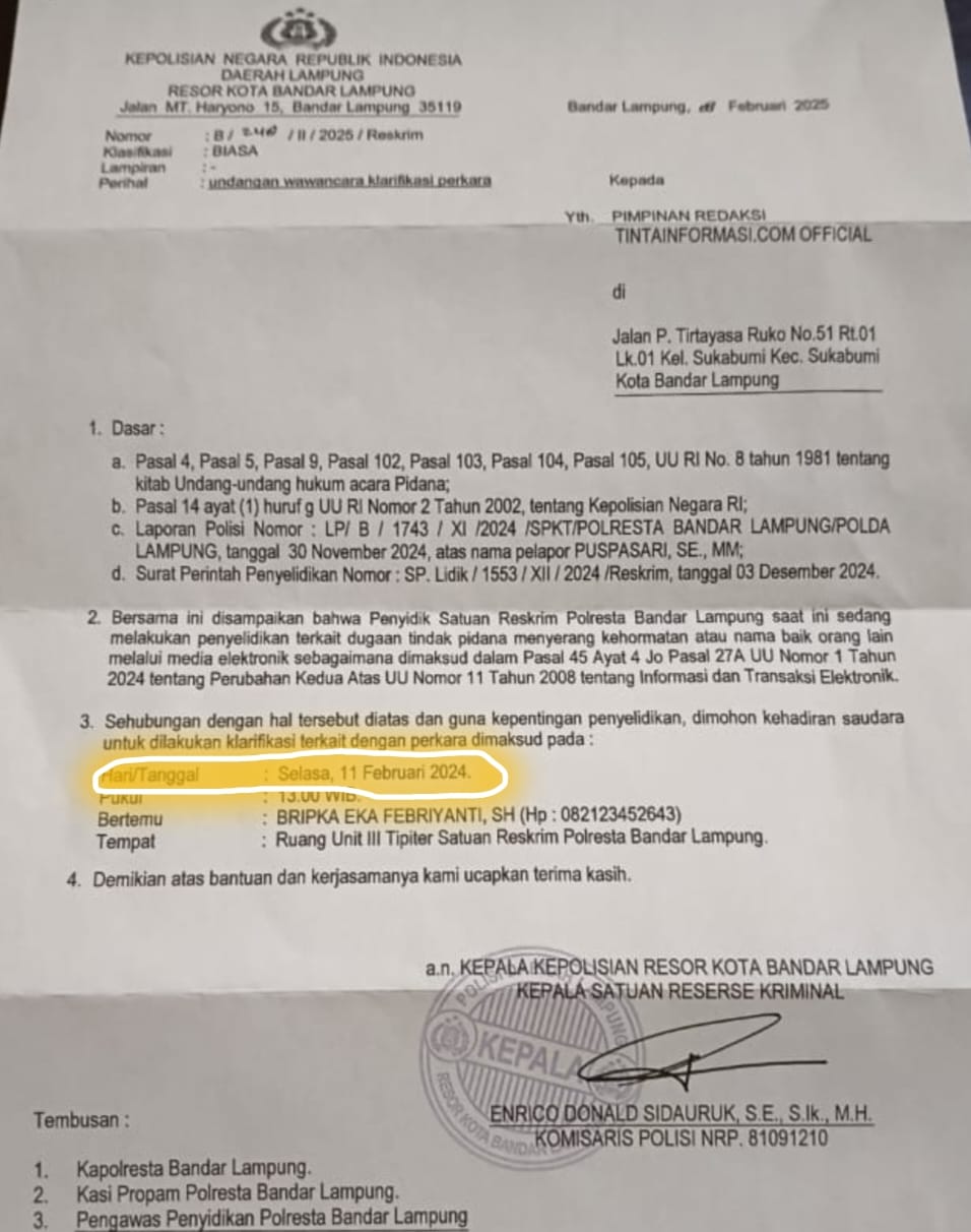 Bandar Lampung – Kebebasan pers kembali mendapat ancaman serius. Seorang wartawan dari media Tintainformasi.com Official dipanggil oleh Satuan Reserse Kriminal (Satreskrim) Polresta Bandar Lampung untuk dimintai klarifikasi terkait dugaan pelanggaran Undang-Undang Informasi dan Transaksi Elektronik (UU ITE).