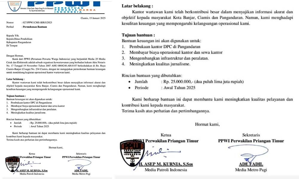 Jakarta,IPK.Com – Hari ini, Kamis, 16 Januari 2025, beredar luas sebuah surat menggunakan Kop Surat PPWI palsu, mengatasnamakan organisasi Persatuan Pewarta Warga Indonesia (PPWI), yang ditujukan kepada Kepala Dinas Pendidikan Kabupaten Pangandaran, tertarikh 15 Januari 2025. Surat tersebut pada intinya meminta bantuan dana sebesar Rp. 25.000.000,- (dua puluh lima juta rupiah) kepada Kepala Dinas Pendidikan Kabupaten Pangandaran. Dalam surat itu, tertulis pembuat dan/atau pengirim surat adalah Ketua PPWI Perwakilan Priangan Timur, H. Asep M. Kurnia, S.Sos dari media Patroli Indonesia, dan Sekretaris PPWI Perwakilan Priangan Timur, Ade Fadil dari media Metro Pagi.