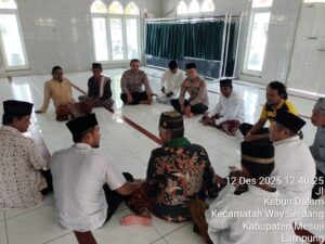 Mesuji – Kapolsek Way Serdang IPTU Dimas Afditiya R, SE, MM, beserta jajarannya mengadakan Jum,at Curhat di Masjid Al-Iman Desa Kebun Dalam, Kecamatan Way Serdang, Kabupaten Mesuji, Lampung, pada Jum,at, 12 Desember 2025.
