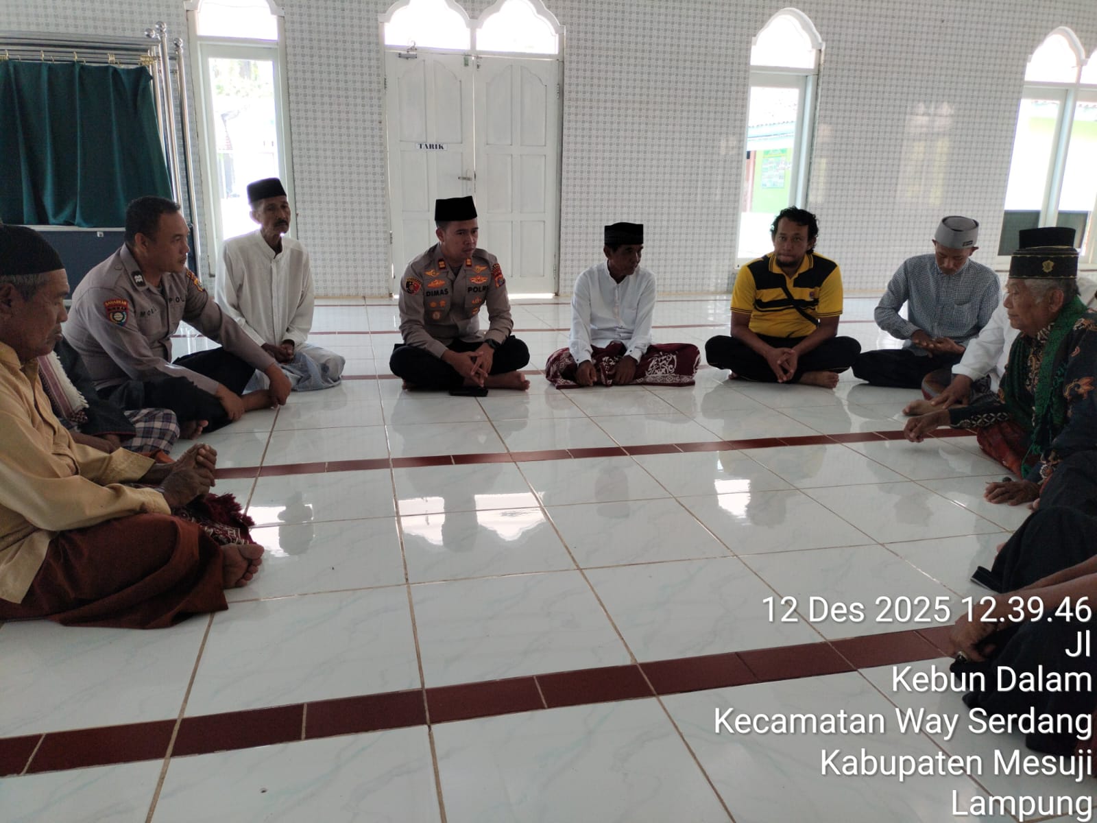 Mesuji – Kapolsek Way Serdang IPTU Dimas Afditiya R, SE, MM, beserta jajarannya mengadakan Jum,at Curhat di Masjid Al-Iman Desa Kebun Dalam, Kecamatan Way Serdang, Kabupaten Mesuji, Lampung, pada Jum,at, 12 Desember 2025.