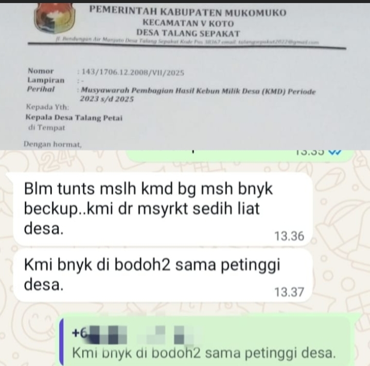 Surat yang dilayangkan oleh Pemdes Talang Sepakat tersebut memuat permintaan untuk mengadakan musyawarah ulang guna membahas secara transparansi dan adil dalam pembagian hasil KMD. Surat tersebut juga menyebutkan bahwa belum ada laporan pertanggungjawaban berupa dokumen atau administratif yang terbuka kepada pihak tiga desa.