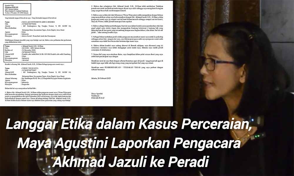 Jakarta – Seorang wanita pemerhati anak dan sosial, Maya Agustini Binti Abdul Rochim, melaporkan advokat bernama Akhmad Jazuli, S.H., M.H., ke Perhimpunan Advokat Indonesia (PERADI) DPC Jakarta Selatan. Laporan ini didasari oleh dugaan pelanggaran etika profesi yang dilakukan oleh advokat tersebut dalam menangani kasus perceraian antara Maya Agustini dan suaminya, Wisnu Wijayanta.