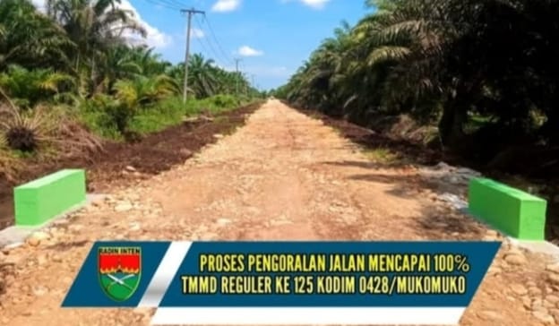 Mukomuko – Setelah melewati berbagai tantangan, pekerjaan pengoralan jalan poros Wonosalam Desa Sumber Makmur Kecamatan Lubuk Pinang, Kabupaten Mukomuko TMMD Reguler ke-125 Kodim 0428/Mukomuko akhirnya rampung 100 persen, Rabu (20/8/25). Pembangunan jalan yang telah selesai dikerjakan oleh Satgas bersama warga setempat ini merupakan salah satu bukti nyata keseriusan pemerintah dalam meningkatkan infrastruktur desa.