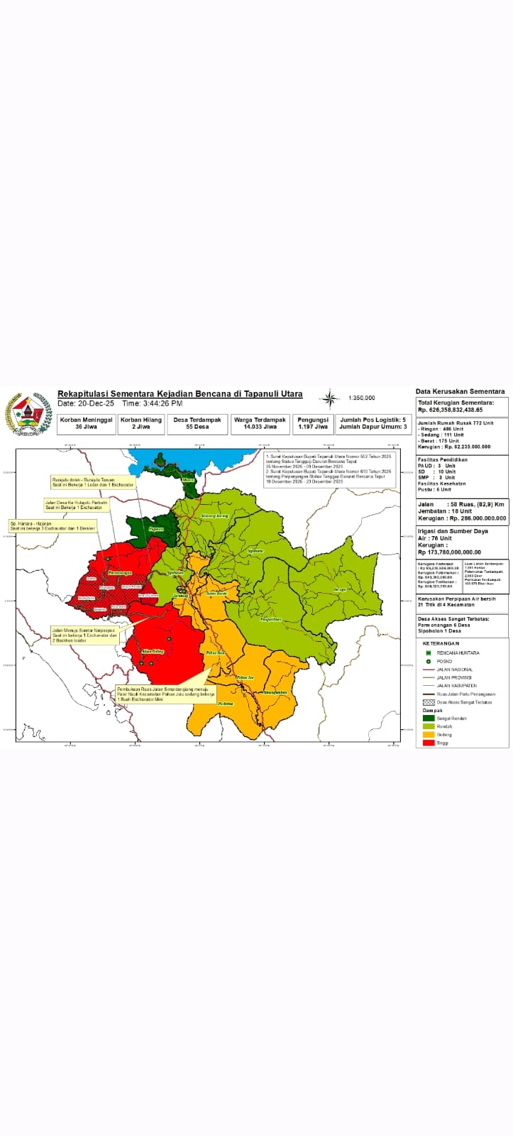 Dari sisi kerusakan, tercatat 772 unit rumah terdampak, serta kerusakan pada 16 fasilitas pendidikan, 6 fasilitas kesehatan, 18 jembatan, dan 58 titik ruas jalan yang mencakup jalan nasional, provinsi, dan kabupaten. Wilayah yang terdampak paling parah berada di Kecamatan Adiankoting dan Kecamatan Parmonangan.