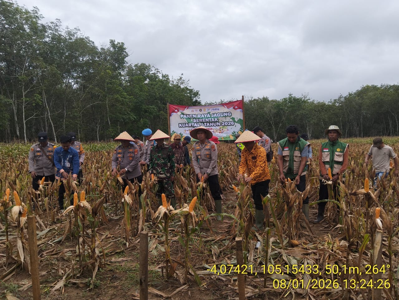 Mesuji – Kepolisian Resor (Polres) Mesuji kembali menunjukkan komitmen dalam mendukung program swasembada pangan nasional dengan melaksanakan kegiatan panen raya jagung serentak kuartal I Tahun 2026 di Desa Gedung Sri Mulyo, Kecamatan Way Serdang, Kabupaten Mesuji. Kamis (08/01/26)