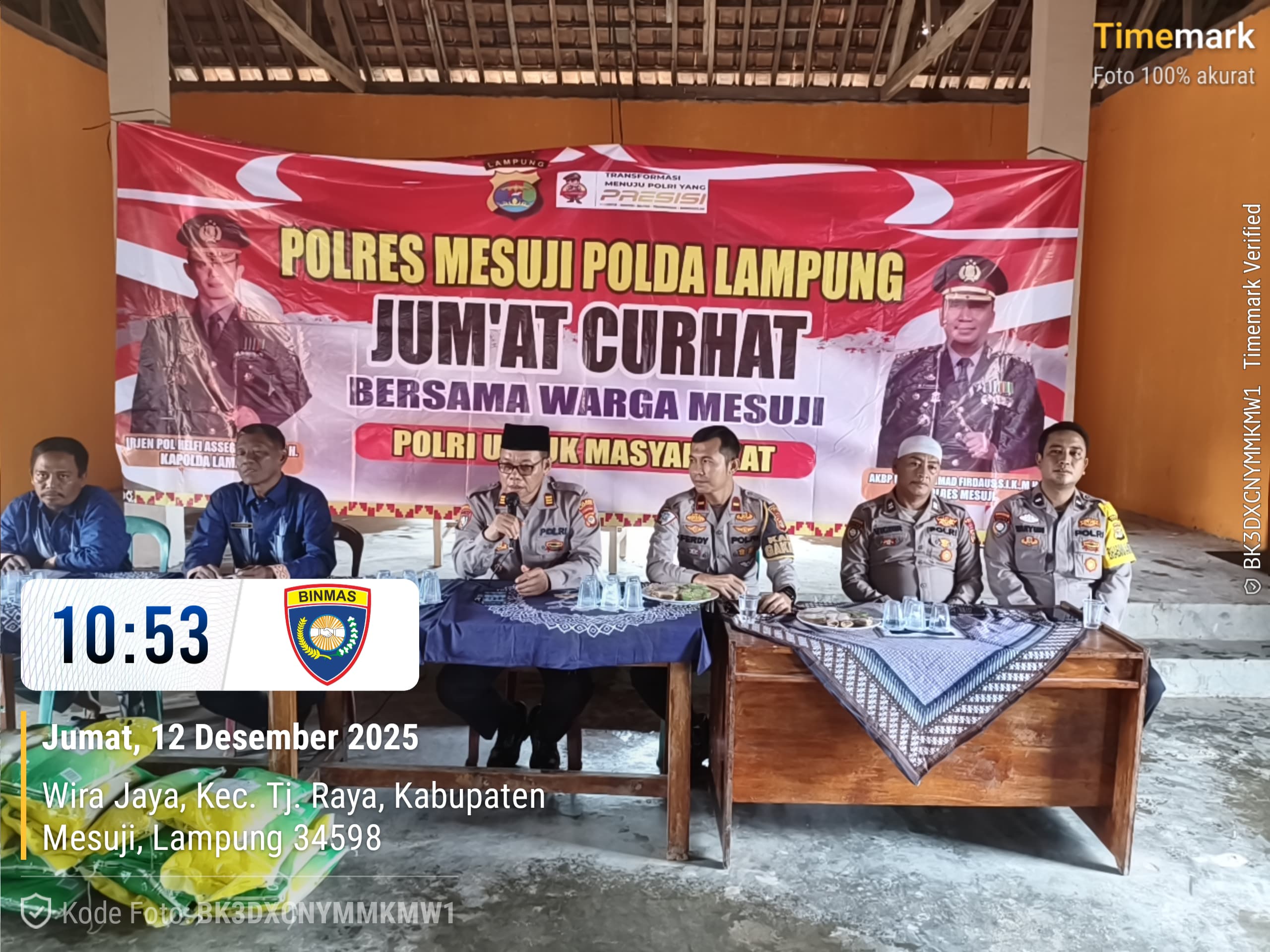 Mesuji – Polres Mesuji melaksanakan kegiatan “Jumat Curhat” dan pembagian 25 paket sembako di Balai Desa Wira Jaya, Kecamatan Tanjung Raya, Kabupaten Mesuji. Jumat (12/12/25)