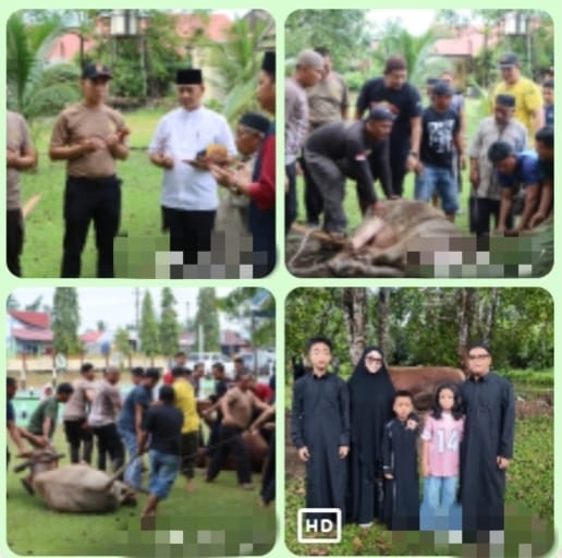 Mukomuko – Dalam rangka menyambut Hari Raya Idul Adha 1446 Hijriah, Polres Mukomuko menggelar pemotongan hewan qurban di Lingkungan Rumah Dinas Kapolres Mukomuko, Kelurahan Bandaratu Kecamatan Kota Mukomuko. Kegiatan penyembelihan hewan qurban dipimpin langsung oleh Kapolres Mukomuko, AKBP RIky Crisma Wardana.S.I.K., yang turut dihadiri oleh Wakapolres Mukomuko dan para PJU, Ketua Bhayangkari dan anggota, Tokoh masyarakat, Tokoh Agama, dan warga sekitar serta personel Polres Mukomuko, Jumat (06/06/2025).