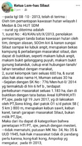 Lebih lanjut Hidayat Saleh mengatakan, saya baru saja menerima pesan WhatsApp dari tokoh adat Kenegerian Silaut tersebut, perkiraan pukul 20.15 Wib, dipesan tersebut dikatakan, sesuai dengan SK Nomor: 776/Menhut II/2014 yang termasuk di halaman 6 huruf (b), terdapat lahan perkebunan masyarakat seluas 1.183 hektar dan dibuktikan dengan tata batas areal IUPHHK- HTI PT. Sukses Jaya Wood pada tanggal 17 Juni 2017, dari patok 01 sampai dengan patok 58 (5 KM) 800 meter merupakan tanaman pohon sawit dan tanaman kebun karet garapan milik warga masyarakat Silaut, dan bukan milik PT. Sukses Jaya Wood (SJW)., “ungkap Hidayat pada media (9/2/2025))