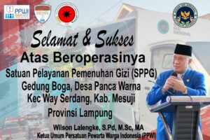 Mesuji – Ketua umum PPWI, Wilson Lalengke, S.Pd, M,Sc, MA, mengatakan hari ini, Senin, 15 September 2025, Program Satuan Pelayanan Pemenuhan Gizi (SPPG) Gedung Boga, milik Ketua PPWI Mesuji, Lampung, mulai beroperasi. SPPG ini dikelola di bawah bendera Yayasan Satuan Kerja Kesejahteraan Prajurit (SKKP). Selamat dan Sukses untuk PPWI Mesuji. “ungkap Ketua umum PPWI Wilson Lalengke.