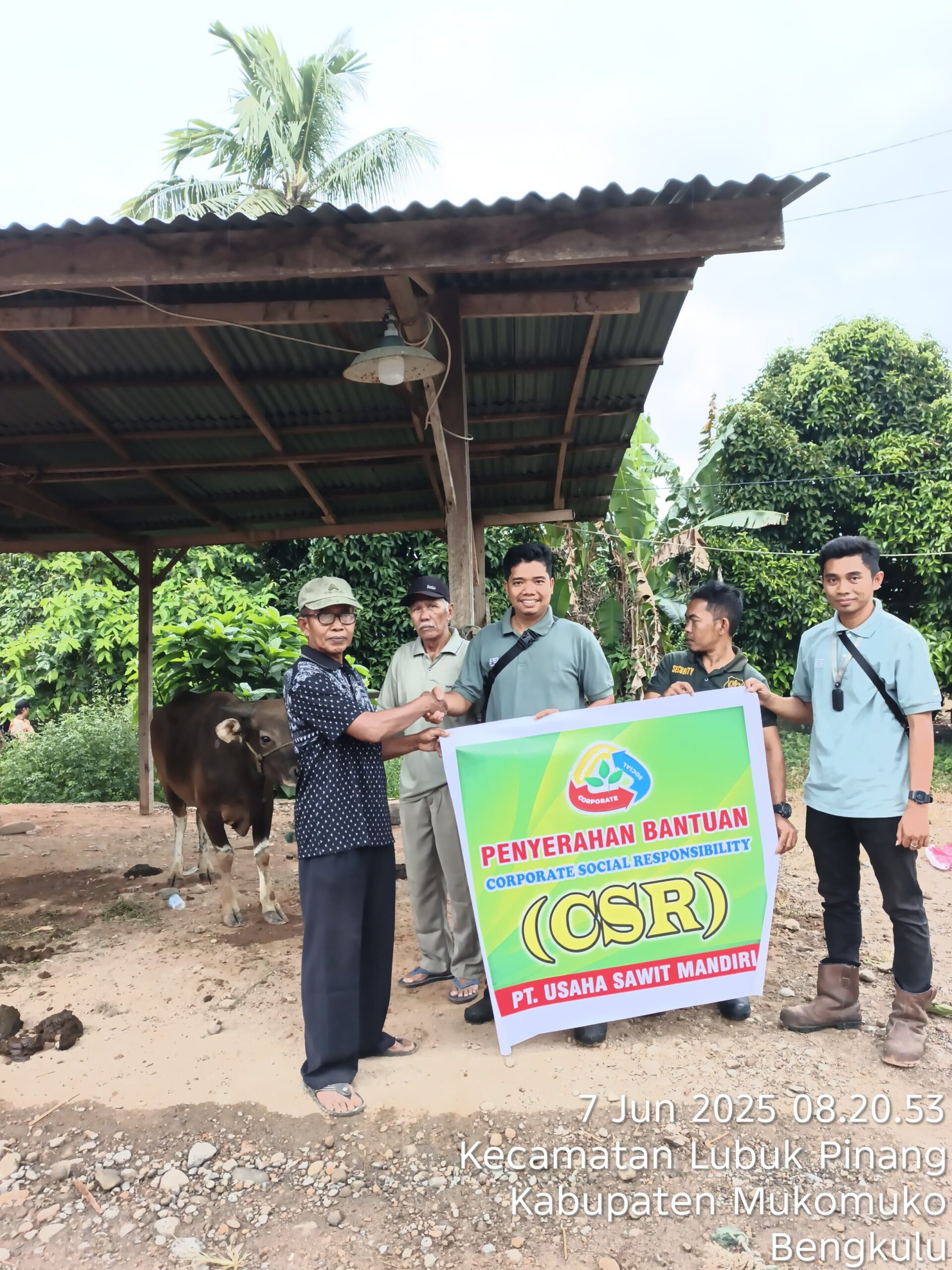 Mukomuko – PT Usaha Sawit Mandiri (USM) menyerahkan bantuan Corporate Social Responsibility (CSR) dalam momentum Hari Raya Idul Adha di Masjid Taqwa Lubuk Pinang, Desa Lubuk Pinang, Kecamatan Lubuk Pinang, Kabupaten Mukomuko, Provinsi Bengkulu. Bantuan tersebut diterima oleh pengurus masjid dan Pemerintah Desa (PEMDES) Lubuk Pinang. Selasa. 07 Juni 2025.
