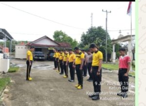 Mesuji – Rutinitas Kapolsek Way Serdang IPTU DIMAS AFDITIYA R, SE, MM beserta jajaran mengadakan giat Jum,at Sehat Jasmani dengan melaksanakan jalan sehat, dan olah raga pagi. Giat tersebut di mulai dari pukul 6,00 pagi keliling di jalan poros Desa Kebun Dalam, Kecamatan Way Serdang, Kabupaten Mesuji, Lampung, hingga pukul 10,00 WIB, pada Jum,at, 9 Januari 2026.