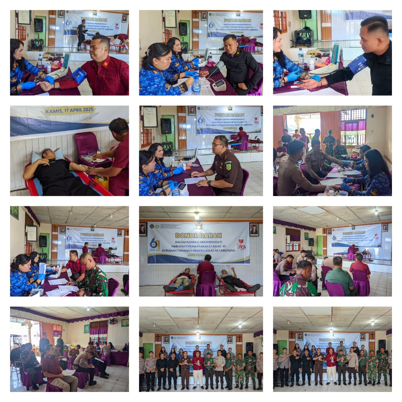 Tarutung, Sumut- Dalam rangka memperingati Hari Bakti Pemasyarakatan (HBP) ke-61 Tahun 2025, Kepala Rumah Tahanan Negara (Ka. Rutan) Kelas IIB Tarutung, Evan Yudha Putra Sembiring bersama Kasubsi Pelayanan Tahanan, Jonias B. Pakpahan, Kasubsi Pengelolaan, Mian H.R. Simarmata, Kepala Kesatuan Pengamanan Rutan, James Bond Naibaho serta seluruh jajaran pegawai mengikuti donor darah yang digelar di aula serba guna Rutan Tarutung, Kamis (17/04). Kegiatan donor darah juga diikuti personil Polres Tapanuli Utara, personil Kodim 0201/TU dan Kejaksaan Negeri Tapanuli Utara.