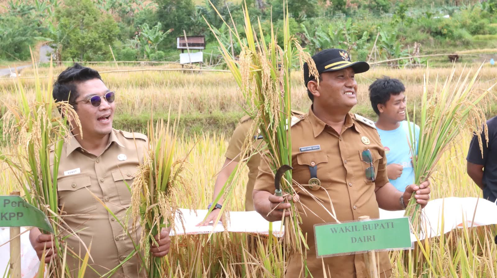 Dairi – Wakil Bupati Dairi, Wahyu Daniel Sagala didampingi Kepala Dinas Pertanian, Ketahanan Pangan dan Perikanan (DPKPP) Kabupaten Dairi Robot Simanullang, jajaran Dinas DPKPP, Babinsa, Babinkambtibmas, serta Penyuluh Pertanian melakukan panen padi bersama kelompok tani Desa Gunung Meriah Kecamatan Siempat Nempu Hulu, Selasa (08/07/2025).