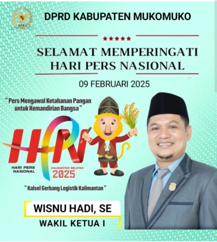 Wisnu Hadi, SE, Wakil Ketua I DPRD Kabupaten Mukomuko, Mengatakan sesuai dengan tema hari pers Nasional, tentang peran pers yang penting untuk mengawal ketahanan pangan dan kemandirian bangsa mencerminkan pemahaman yang mendalam mengenai fungsi media dalam pembangunan nasional.